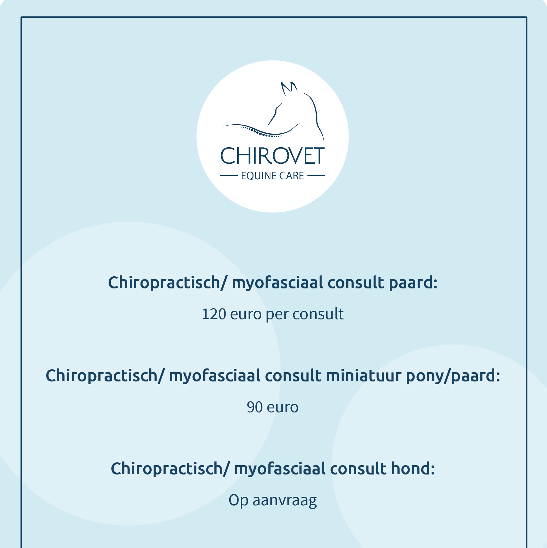 Voor de consulten staat een vaste prijs, ongeacht hoelang het consult duurt. De consulten zullen ruim worden gepland waardoor ik alle tijd kan nemen die je dier nodig heeft.